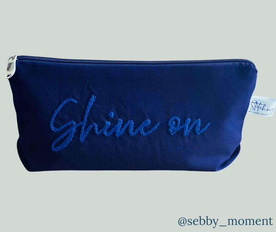 Sötétkék alapon „Shine on” kézzel hímzett felirattal. Csoda neszesszer, mely a legfontosabb dolgokat mindig kéznél tartja.