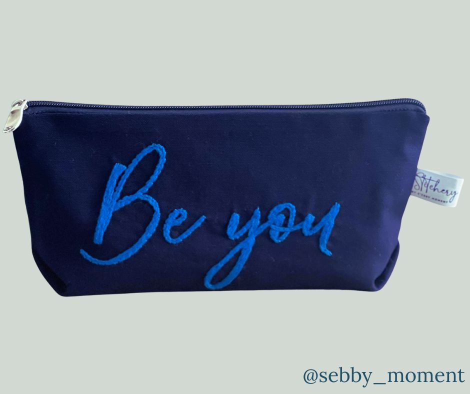 Sötétkék alapon „Be you” kézzel hímzett felirattal. Csoda neszesszer, mely a legfontosabb dolgokat mindig kéznél tartja.