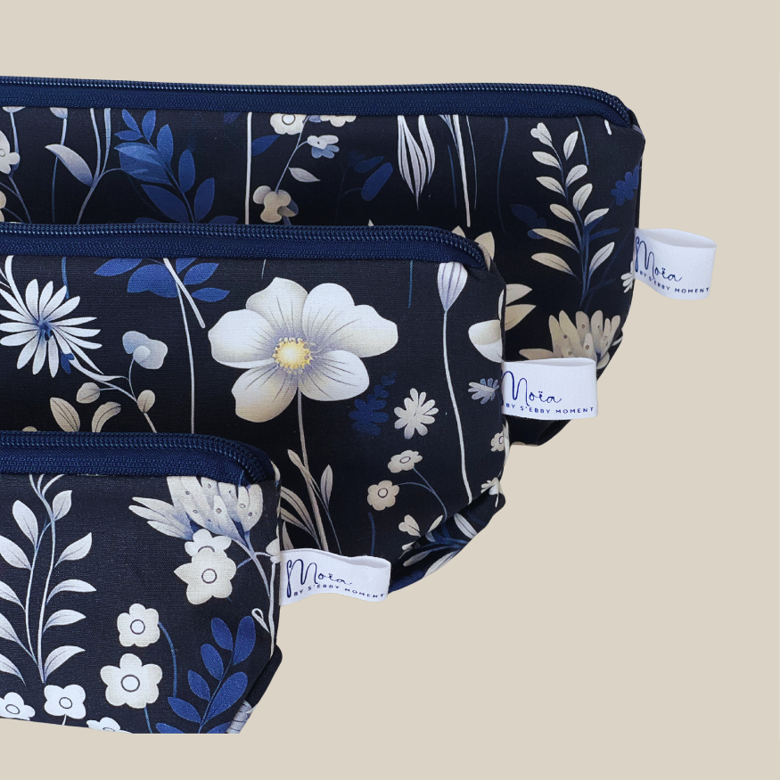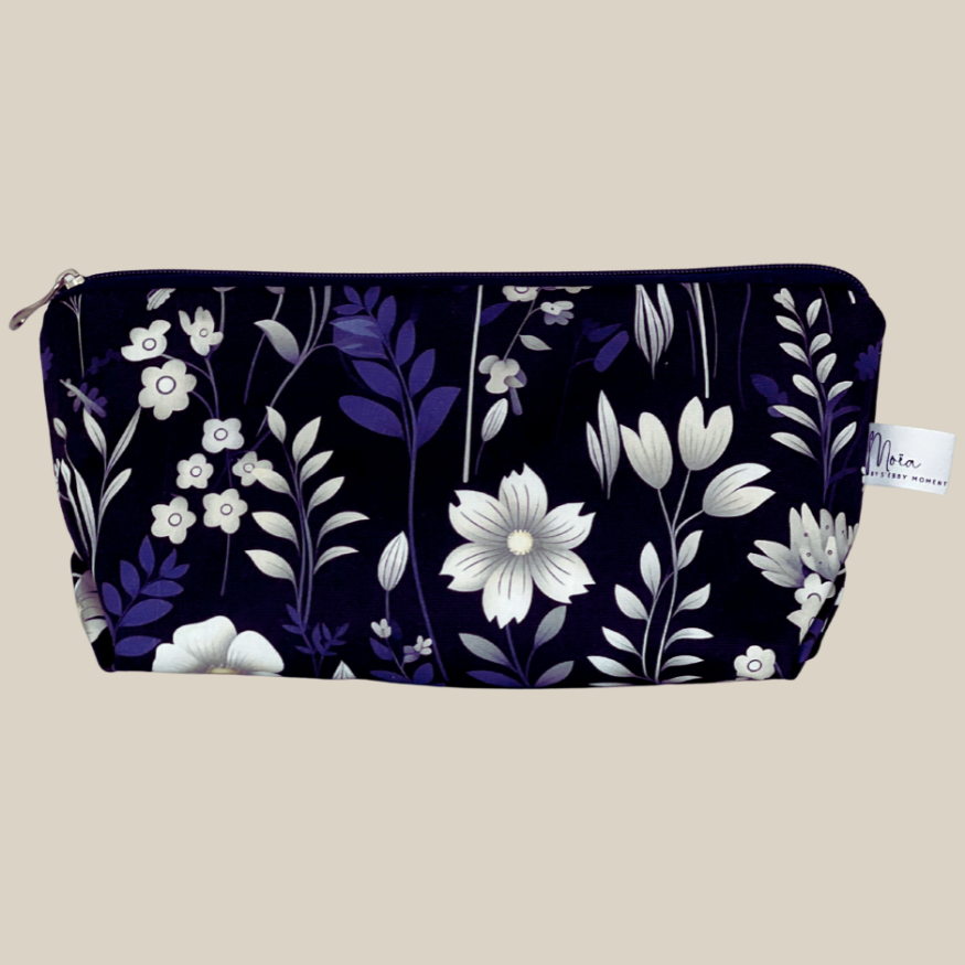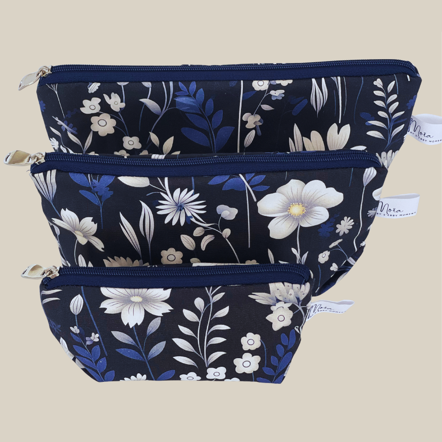Különböző méretű,  hatásos neszesszer Éjféli mező változatban, amely a legfontosabb dolgokat mindig kéznél tartja. Sötétkék alapon finom, világos virágok.